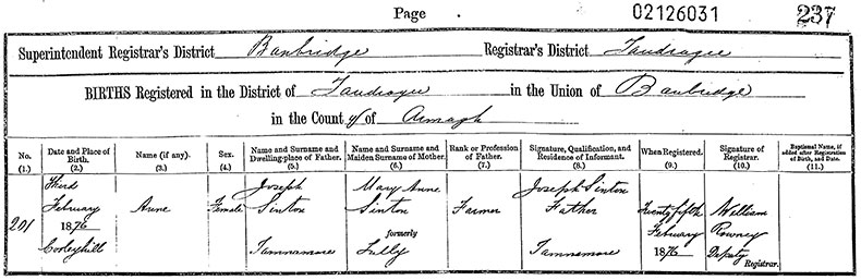 | [ s1547 ] | Birth Certificate - Birth of Anne Sinton to Joseph and Mary Sinton on 3 February 1876 in Cooleyhill (Townland), Tandragee, Co. Armagh, Ireland, United Kingdom - Registration District: Banbridge, Volume Number: 1, Page Number: 237, Index Number: 201 - BC1876-03-02-AS |