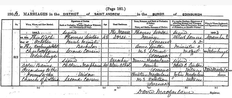 | [ s3425 ] | Marriage Registration - Marriage of Thomas Sinton and Catherine MacPherson on 30 October 1903 in the Roxburgh Hotel, Charlotte Square, Edinburgh, Scotland, United Kingdom - General Register Office for Scotland, Marriages 1903, District of Saint Andrew, Burgh of Edinburgh, Page 181, Index Number 362 - MR1903-30-10-TS-CM |