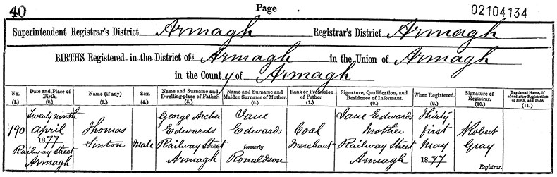 | [ s1602 ] | Birth Certificate - Birth of Thomas Sinton Edwards to George and Jane Edwards on 29 April 1877 - Branbrook Hill, Armagh City, Co. Armagh, Ireland, United Kingdom - Registration District: Armagh, Registration Quarter and Year: 1877, Volume Number: 6, Page Number: 40, Index Number: 190 - BC1877-29-04-TSE |