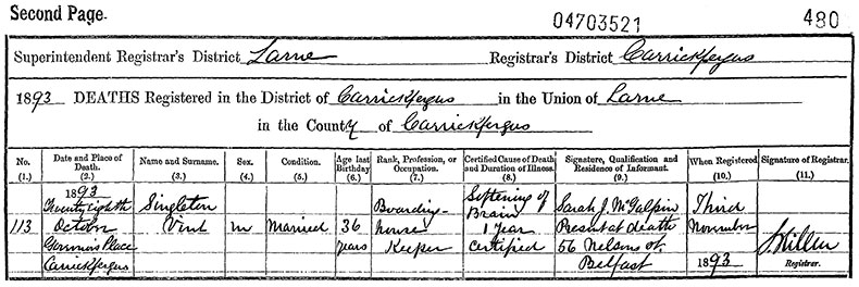 | [ s2074 ] | Death Certificate - Death of Singleton Vint on 28 October 1893 in Governors Place, Carrickfergus, Co. Antrim, Ireland, United Kingdom - Registration District: Larne, Registration Quarter and Year: Oct - Dec 1893, Volume Number: 1, Page Number: 480, Index Number: 113 - DC1893-28-10-SV |