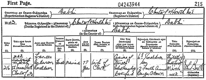 | [ s4615 ] | Death Certificate - Death of Frances Anderson Ronaldson (née Hunt) on 26 March 1943 in 55 Vernon Park, Clontarf, Co. Dublin, Republic of Ireland - Registration District: Dublin North, Registration Quarter and Year: Jan - Mar 1943, Volume Number: 2, Page Number: 215, Index Number: 216 - DC1943-26-03-FAR |